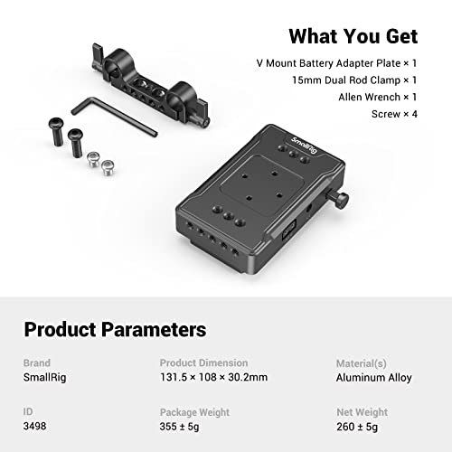 [ALIMENTA LE TUE FOTOCAMERE] La piastra adattatore per batteria con attacco a V SMALLRIG con morsetto a doppia asta 3498 è progettata per fornire una maggiore durata della batteria al tuo impianto fotografico tramite una batteria con attacco a V. Utilizza la struttura V-port standard che si adatta alla maggior parte delle batterie con attacco V sul mercato. È compatibile con fotocamere Mirrorless e DSLR.