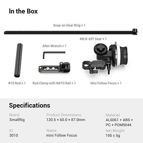 【Per il Controllo Della Messa a Fuoco】SMALLRIG mini Follow Focus 3010B è progettato per un controllo della messa a fuoco facile e veloce nelle riprese video. È fissato sul lato sinistro dell'obiettivo tramite asta e morsetto per asta da Φ15 mm (con guida NATO).