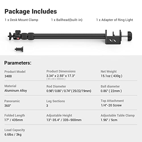 PINZA DI MONTAGGIO DELLA LUCE PER UFFICO: Il supporto per fotocamera si adatta a diversi tavoli regolando il pulsante in basso ed è adatto per il tavolo il cui spessore può raggiungere 6 cm/2,36". Risparmia più spazio rispetto al treppiede leggero. La capacità di carico massima è di 6,6 libbre /3 kg.