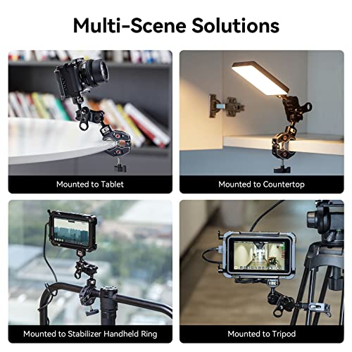 Ampia compatibilità: Il morsetto è dotato di un foro filettato da 1/4"-20, un foro filettato da 3/8"-16 e un foro di posizionamento da 3/8"-16 per lo standard ARRI per varie soluzioni di espansione, in modo da poter collegare le telecamere, monitor, luci a LED, ecc. per arrotondare tubi, tavoli, manubri, treppiedi e anelli stabilizzatori portatili.