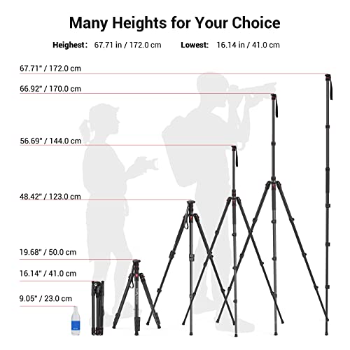 Carico massimo di 33 libbre / 15kg e facile da trasportare: Il treppiede DSLR offre un elevato livello di stabilità utilizzando un ottimo livello di qualità della lega di alluminio e magnesio. Può sopportare fino a 33 libbre (15 kg). Il peso netto del treppiede è di 2,42 libbre, la lunghezza di archiviazione è di soli 41 cm/16,1" e il treppiede leggero viene fornito con una borsa per il trasporto, puoi facilmente portare il treppiede ovunque tu voglia andare.