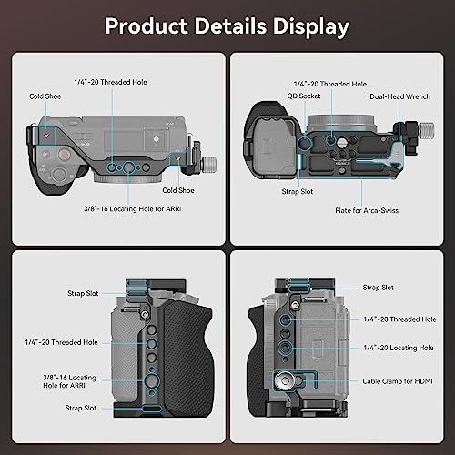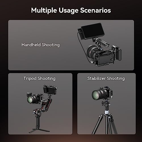 [Opzioni di montaggio multiple] La gabbia presenta più punti di montaggio per gli accessori, inclusi fori filettati da 1/4"-20 e fori di posizionamento da 3/8"-16 per ARRI per maniglia superiore 3765, maniglia laterale 2916, supporto per monitor 2903B. Inoltre, due supporti cold shoe nella parte superiore della gabbia sono compatibili con SMALLRIG Microphone 3468 o LED Video Light 3286B, ecc.