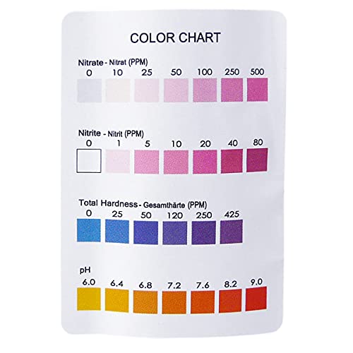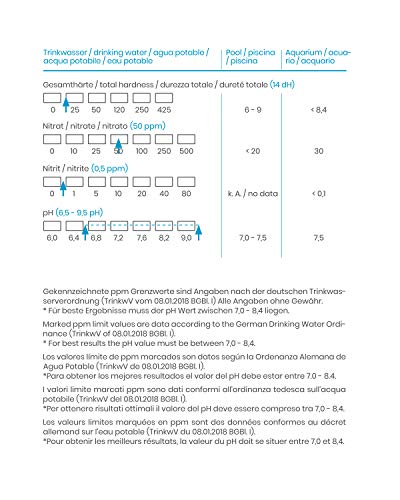 Test rapido: con una sola striscia di test verificherete quattro dei più importanti valori dell‘acqua: Nitrati, nitriti, durezza totale (GH) e valore PH in maniera rapida, semplice economica e precisa