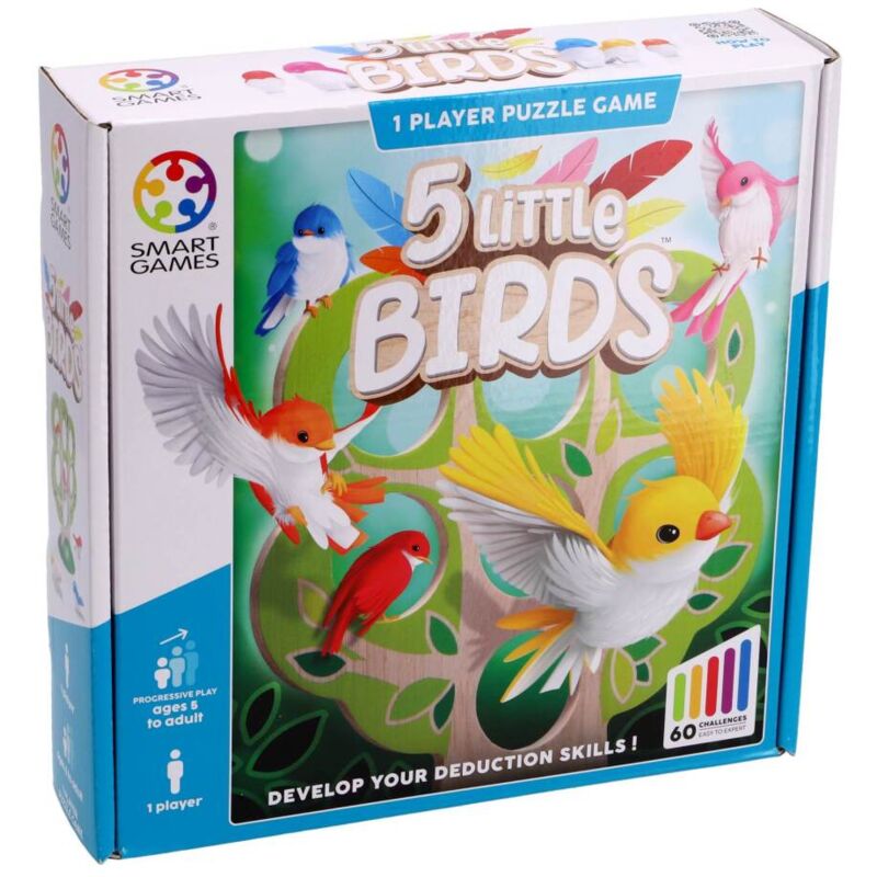 Giochi Intelligenti Gioco di pensiero con 5 uccellini Usa la logica e la deduzione per trovare il punto preferito di ogni uccellino sull'albero. 60 sfide che vanno da facili a molto impegnative. Adatto per 1 giocatore dai 5 anni in su.