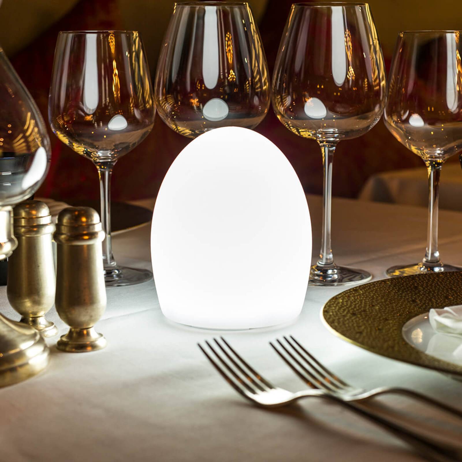 Point - lampada decorativa LED con accumulatore e regolazioni via app Point è una lampada decorativa a LED particolarmente apprezzata nella ristorazione: per esempio la si vede spesso nei bar delle navi da crociera AIDA. Funziona con un accumulatore e quindi la si dispone ovunque, senza bisogno di scomodi cavi da allacciare alla corrente. All'interno si trova un'unità luminosa chiamata BulbLite che si aziona con un pulsante alla base della lampada oppure con una app su smartphone e tablet. I LED dell'unità sono sia RGB che bianchi e consentono pertanto modalità d'illuminazione molto differenti. Con il pulsante manuale si possono scegliere 7 colori e 3 modalità di funzionamento. Con lo smartphone invece le possibilità sono praticamente infinite. Basta scaricare la app gratuita Smart & Green, disponibile per Android e IOS: via Bluetooth si impostano innumerevoli scenari, sequenze colorate e così via. La fornitura della lampada Point comprende una stazione di carica induttiva per ricaricare l'accumulatore della lampada. La ricarica impiega al massimo 6 ore. A carica completa la lampada rimane accesa fino a 10 ore, a seconda dell'intensità impostata.