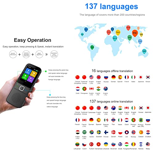 【Traduzione rapida in 0,5 secondi】 Può ottenere una risposta rapida entro 0,5 secondi. Quindi riproduci le traduzioni con un suono chiaro o visualizza il testo sul touchscreen IPS da 3". Inoltre, il nostro dispositivo di traduzione può registrare fino a 60 minuti di audio inglese/mandarino/cantonese e quindi esportare il testo tradotto su un laptop o un PC tramite questa voce istantanea traduttore