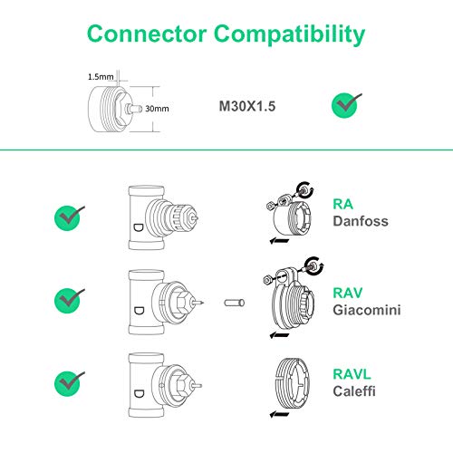 【Adattatore Compatibile】-- Questa termostatica è adatta per radiatori con interfaccia valvola filettata M30 * 1,5 mm. Compatibile con i connettori delle tre marche di radiatori più