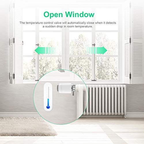 【Risparmio energetico】-- Maxcio termostato può regolare l'apertura della valvola in base alla temperatura ambiente e alla temperatura impostata per ottenere un migliore stato di risparmio energetico. Con la funzionalità rilevazione di finestra aperta, arresta automaticamente il riscaldamento quando la temperatura ambiente scende di 6℃ in 4 minuti, TRV chiuderà automaticamente la valvola.