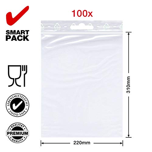 SmartPack 100 sacchetti con chiusura a pressione 220 x 310 mm, DIN A4, 50 mµ di spessore, con foro europeo, sacchetti richiudibili, zip lock.