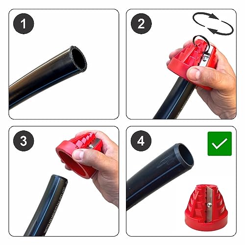 Strumento facile da usare: inserisci il tubo nello smussa-tubi in plastica. Ruota lo strumento per la sbavatura attorno al bordo del tubo, in modo che la lama rimuova la plastica in eccesso, ed ottieni un bordo liscio e leggermente angolato per un inserimento nei raccordi senza reistenza.