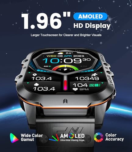 【Display AMOLED - Più chiaro】 Lo smartwatch adotta un display a colori HD AMOLED da 1,96" con risoluzione 410*502, chiaramente visibile anche all'aperto. Il display AMOLED è in grado di controllare il modo in cui ogni pixel emette luce, con un risparmio energetico maggiore rispetto al display LCD. Questa tecnologia dello schermo non solo garantisce il piacere della vista, ma contribuisce anche a prolungare la durata della batteria e a mantenere lo smartwatch uomo efficiente per lungo tempo.