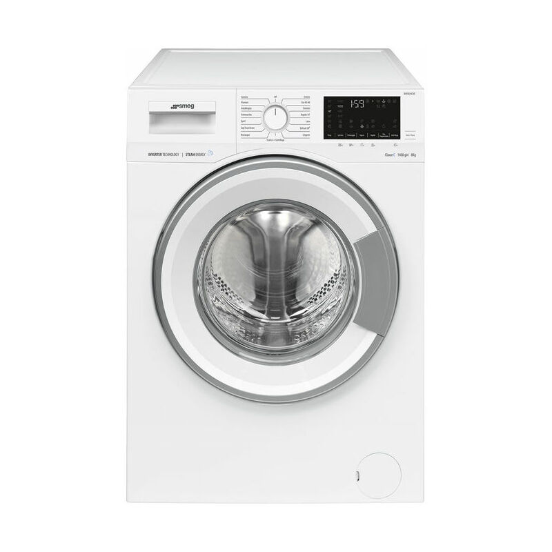 Smeg WHT814CSIT. Tipo di carica: Caricamento frontale. Capacità cestello: 8 kg, Classe di efficienza della centrifuga: B, Silenziosità (centrifuga): 72 dB, Velocità di centrifuga massima: 1400 Giri/min. Colore del prodotto: Bianco. Larghezza: 600 mm, Profondità: 540 mm, Altezza: 840 mm. Classe efficienza energetica: C