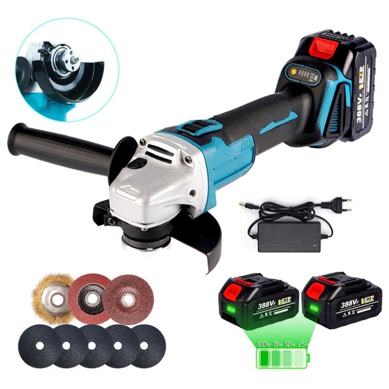 Si prega di informarsi prima di ordinare: Questo prodotto non è un prodotto Makita originale ed è compatibile solo con batterie Makita da 18 V. La confezione contiene: 1 smerigliatrice angolare 2 batterie 1 caricabatterie 8 lame per sega 1 maniglia 1 deflettore 1 chiave inglese Specifica: Nome: smerigliatrice angolare a batteria 125 mm. Adatto per batteria Makita 18V (non inclusa). Tensione: 18 V Motore: senza spazzola Colore: blu + nero Regime al minimo: 12.000 giri/min. Dimensioni del mandrino del trapano: 6 mm Diametro del mandrino: 14 mm Diametro della mola: 125 mm Funzionalità -Schermo intelligente, visualizza gli errori della macchina in tempo reale. -Maniglia piccola, leggera, piccola operazione all'aperto. -La rete protettiva rimovibile impedisce l'ingresso di sporco e prolunga la durata. -Motore con nucleo in rame, ad alte prestazioni, resistente al sovraccarico, impedisce alla macchina di bruciarsi. -Super dissipazione del calore, dissipazione del calore tridimensionale