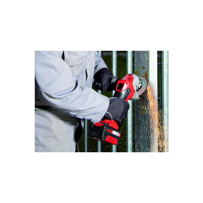 La smerigliatrice angolare a batteria einhell te-ag 18/115 li è la più leggera della sua categoria ed è un aiutante irrinunciabile per svolgere lavori di smerigliatura e separazione. grazie alla robusta scatola porta ingranaggi in alluminio e al disaccoppiamento di motore e ingranaggi, il funzionamento è estremamente silenzioso. la funzione soft start e la protezione di sicurezza contro l'avvio accidentale rendono la smerigliatrice angolare a batteria sicura e confortevole. la struttura snella e compatta con impugnatura ergonomica antiscivolo e la flessibile impugnatura supplementare montabile in tre posizioni consentono un grande comfort d uso dell apparecchio. il condotto dell'aria modificato garantisce un raffreddamento ottimale dell apparecchio e protegge gli ingranaggi durante il lavoro. la protezione del disco può essere adeguata a qualsiasi lavoro da svolgere in un instante. la protezione da sovraccarico assicura inoltre una maggiore sicurezza e durevolezza. grazie alla