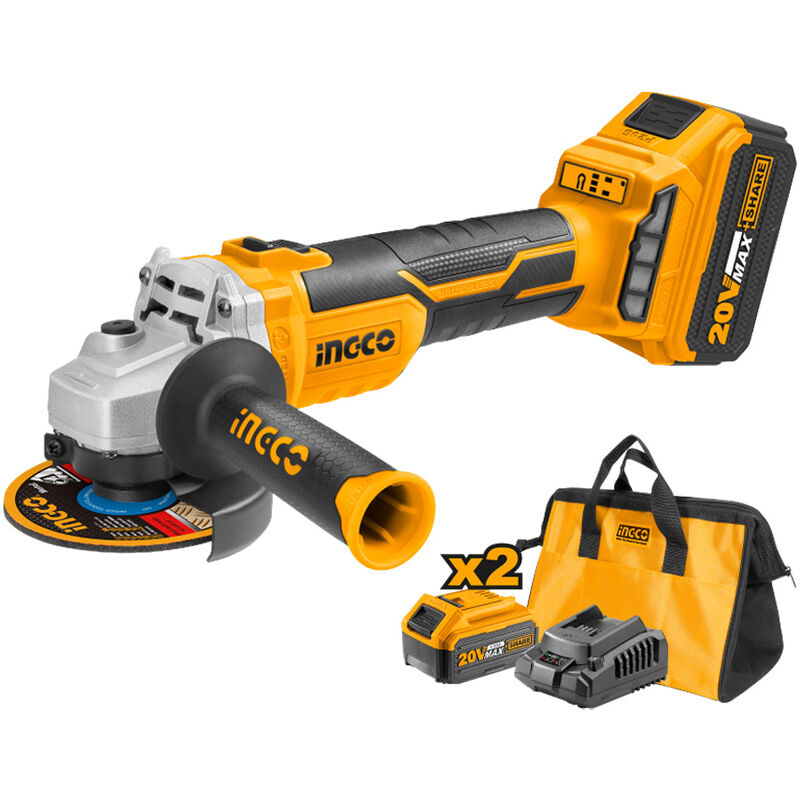 Smerigliatrice angolare a batteria da 20V con motore Brushless (senza spazzole). Serie Industrial di INGCO. Per rimuovere eccessi di saldatura, tagliare tubi in metallo, spianare la malta fra i mattoni, rimuovere la ruggine, ecc. Potente batteria 20V Max da 4.0 Ah che assicura prestazioni più che ottimali. Utilizza dischi da 115 mm di diametro. L'offerta include anche una borsa in tela di cotone, 2 batterie al litio da 4.0 Ah ed un caricabatterie 60 minuti. Contenuto della confezione: 1x Borsa in Tela 1x Smerigliatrice a Batteria 20V 2x batteria al Litio 4.0 Ah 1x Caricabatterie 60 Min