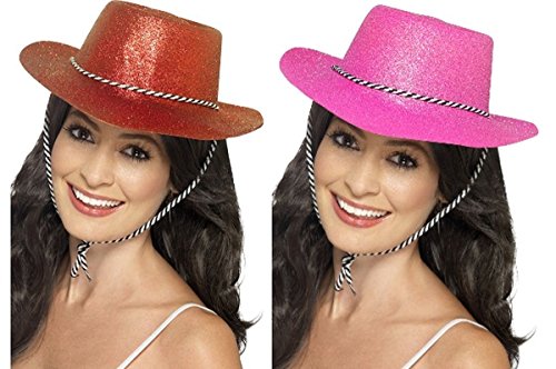 SMIFFYS Smiffy's Cappello da cowboy glitterato, fosforescente con corda Uomo, Rosa fluo, Taglia unica, 24185