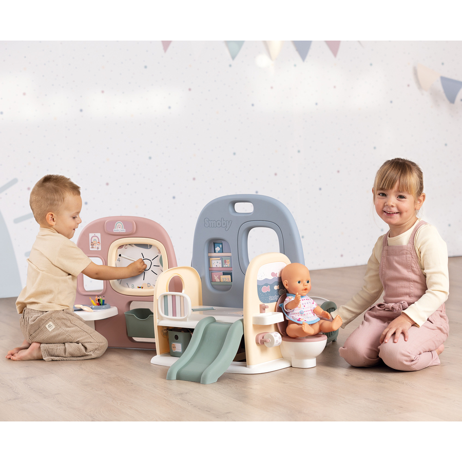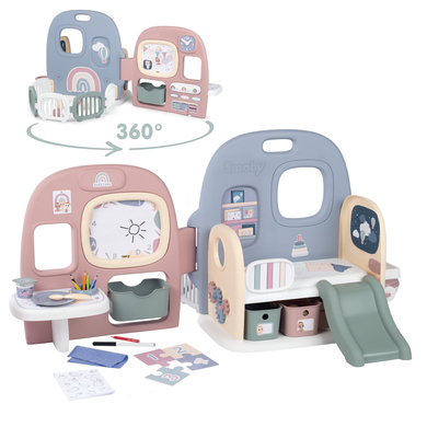 c'è anche un orologio per imparare e una parete per i compleanni. Si passa poi all'area giochi, che può essere chiusa da un box a cinque elementi per consentire ai piccoli di giocare in sicurezza nel box Grazie al piccolo bagno con wc, lavandino e rotolo di carta igienica, i bambini possono dedicarsi all'igiene personale in modo giocoso. Per il riposino pomeridiano delle bambole, c'è un letto a soppalco separato con scivolo Nella zona pranzo e creativa combinata, da un lato viene servito il pranzo e dall'altro i bambini possono dedicarsi all'attività artistica con la piccola lavagna White board . C'è anche un libro da colorare e sei pastelli. Sotto ci sono due scatole portagiochi per riporre gli accessori. Grazie al meccanismo pieghevole e alla maniglia per il trasporto, la cameretta Baby Care può essere comodamente ripiegata e riposta al termine del gioco. Numerosi accessori completano le ampie funzioni di gioco: 4 palline, un piatto, un cucchiaio, uno yogurt, un puzzle, un pennarello, 6 pastelli e un blocco per colorare, oltre a un panno in dotazione La varietà di possibilità di gioco supporta il bambino in modo ideale nel suo sviluppo e promuove l'immaginazione e la creatività. Il lettino per bambole Smoby Baby Care è realizzato in plastica di alta qualità nella fabbrica Smoby in Francia ed è adatto a bambole fino a 42 cm. Dimensioni e peso: Dimensioni da montato (lunghezza x larghezza x altezza): 107,9 x 77,9