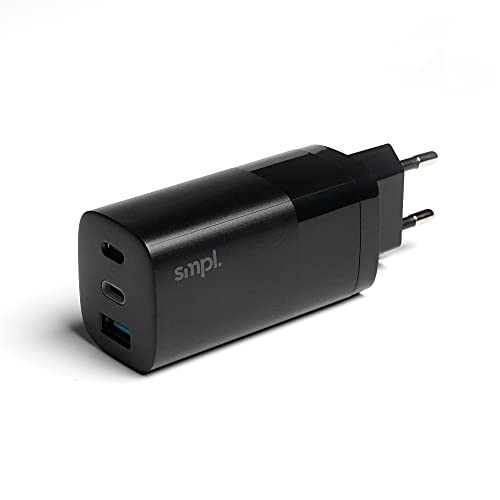 Smpl, caricabatterie GaN - Tecnologia con nitruro di gallio, ricarica rapida 65 W, 3 porte (2 USB C + 1 USB A), ricarica iPhone, iPad, Macbook Apple/Samsung/Huawei/Xiaomi Black