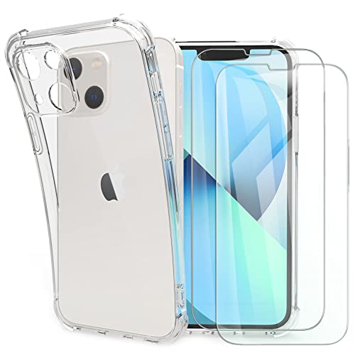 SMYTU Custodia per iPhone 13 6.1" + 2 Pezzi Vetro Temperato,Trasparente Anti-Giallo Case Cover Protettiva Antiurto Leggera e Sottile per iPhone 13 6.1" - Crystal Clear