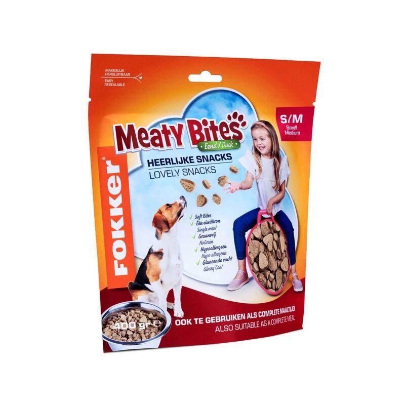 Singola proteina animale (anatra).Dog Meaty Bites Small/Medium - Snack e ricompensa per cani di piccola e media taglia.I Fokker Meaty Bites sono uno spuntino delizioso e una ricompensa per il tuo cane.Molto adatto per l'addestramento e l'educazione. Inoltre, per variare la dieta quotidiana, da utilizzare come pasto premio.Istruzioni:“Meaty Bites” come pasto: un massimo di 15 grammi per kg di peso corporeo al giorno. Non adatto a cuccioli di età inferiore a 4 mesi. Lasciare a disposizione molta acqua fresca da bere. Adatto come mangime completo, mangime integrativo e come ricompensa per cani. Supervisiona il tuo cane mentre mangia.Composizione:Anatra (50,0%);