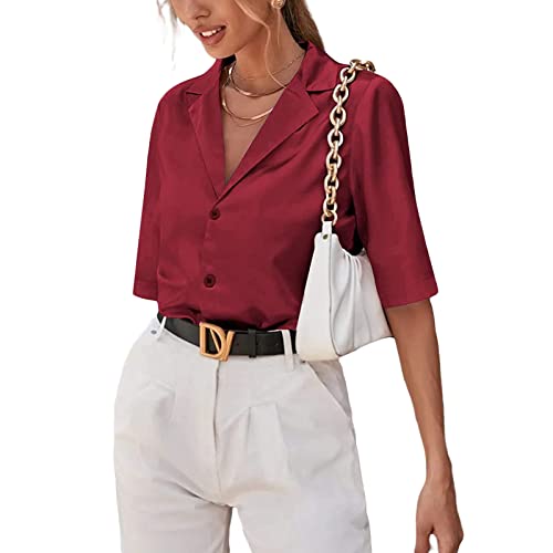 Snaked cat Camicetta da donna con scollo a V Camicia a maniche corte in raso Top con risvolto Camicia estiva traspirante in raso, Rosso vinaccia, M