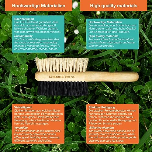 COMPONENTI DEL KIT: Il kit Sneaker Cleaner contiene uno speciale detergente e due spazzole con manico in legno naturale per pulire le scarpe. La spazzola premium è stata sviluppata per materiali delicati. Con la spazzola normale è possibile pulire anche i materiali meno sensibili. Nel kitc'è anche un panno in microfibra resistente e altamente assorbente, che contribuisce alla pulizia completa. Il kit perfetto per pulire le scarpe!