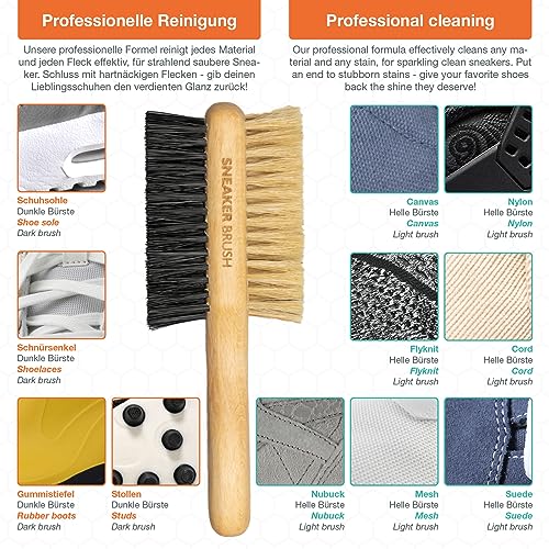 UTILIZZO: Il nostro Sneaker Cleaner può essere utilizzato su diversi materiali. È adatto a materiali sensibili come camoscio, nabuk, nylon, cotone, maglia, ma funziona anche per materiali meno delicati. Non importa quali calzature si desidera pulire, che si tratti delle vostre scarpe da ginnastica bianche preferite, scarpe da lavoro, scarpe da trekking, stivali, ecc. - nessun problema con il nostro kit Sneaker Cleaner.