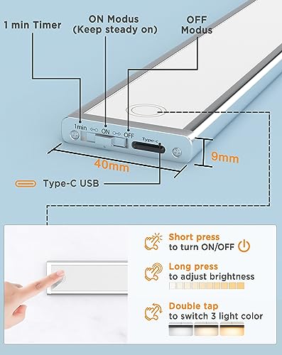 ⏰【Timer di 1 minuto】lampada led cucina si spegne automaticamente 60 secondi dopo l'ultima operazione. MODALITÀ ON: può essere accesa e spenta semplicemente toccando il sensore tattile. Nota: in modalità timer, l'interruttore di accensione/spegnimento non può essere azionato al tatto, ma è possibile regolare solo la luminosità e il calore della luce.