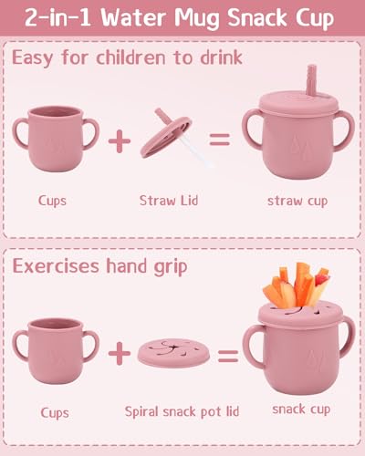 Set per la pappa da 10 pezzi: Il set di stoviglie per bambini comprende una ventosa, una ventosa in silicone, un bavaglino regolabile, un bicchiere 2 in 1, una tazza per snack, una cannuccia in silicone, un paio di forchette e cucchiai corti. Questo nuovo baby set in silicone è composto da due lunghe forchette e cucchiai e contiene tutto ciò di cui il tuo bambino ha bisogno per nutrirsi in modo indipendente.