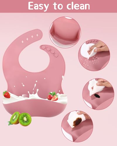 SOBEAU Set di Posate per Bambini da 10 Pezzi, Bavaglini per lo Svezzamento, piatto con ventosa per bambini,Piatto Antiscivolo per Posate Senza BPA (Rosa)