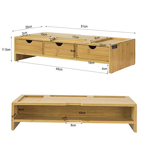 SoBuy Supporto monitor pc da scrivania con 3 Organizzatore cassetti L51*P25*A12 cm, legno massiccio di bambù BBF03-N