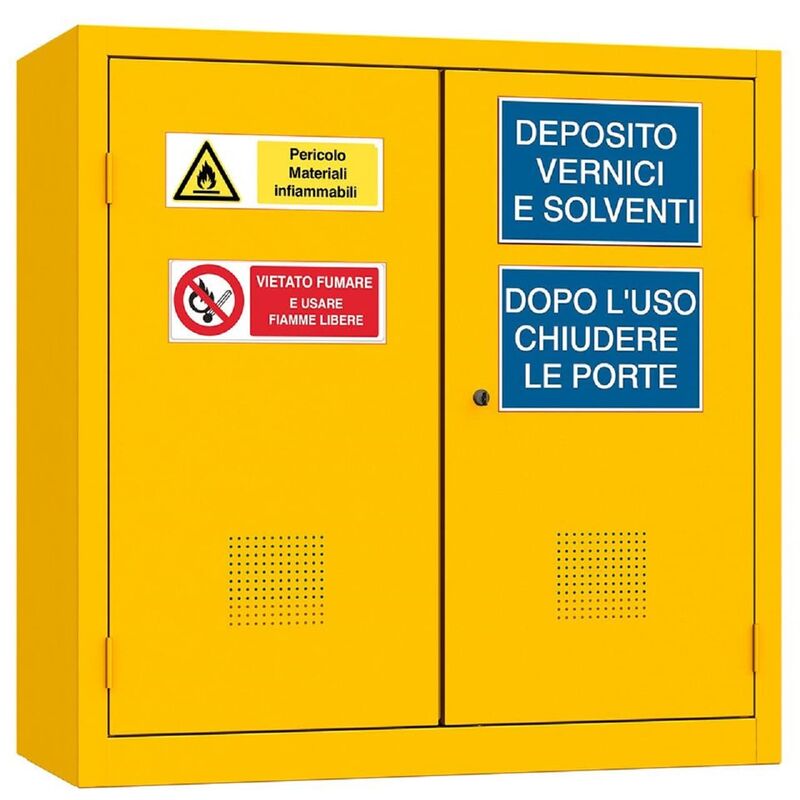 L'armadio per deposito liquidi infiammabili è un'ottima soluzione per lo stoccaggio di materiali pericolosi. Base su zoccolo in acciaio, h. 100 mm. Corpo formato da pannellature spessore 8/10 elettrosaldato, fondo, cappello, schiena, fianchi con cremagliere spessore frontale 30 mm con bordi raggiati. Il colore è giallo che ne permette facilmente la riconoscibilità. Serratura a cilindro e doppia chiave in dotazione.