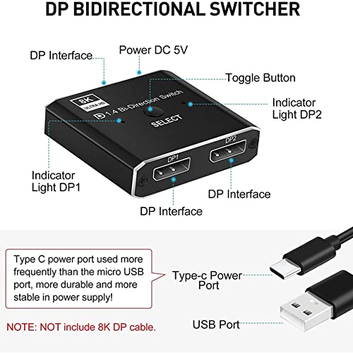 Ampia compatibilità: gli interruttori DP 1.4 sono facili da usare, basta collegare e, non richiede driver, alimentazione esterna. Compatibile con dispositivi con porte DP, come laptop, monitor, proiettori, computer, TV, console di gioco, ecc. L'utilizzo di questo switch DP aumenterà la produttività dell'ufficio. mantenere acceso durante l'uso, altrimenti non verrà visualizzato nulla. (Include il cavo C, non include il 5 V.)