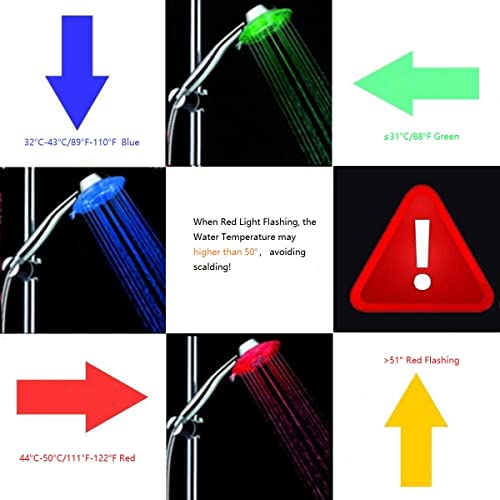 3 colori cangianti: il colore cambia insieme alla temperatura dell'acqua (verde ≤ 31 °C/88 °F, blu 32 °C-43 °C/89 °F-110 °F, rosso 44 °C-50 °C/111 F-122 °F e più di 50 ℃ flash rosso), ricorda la temperatura dell'acqua per evitare scottature.