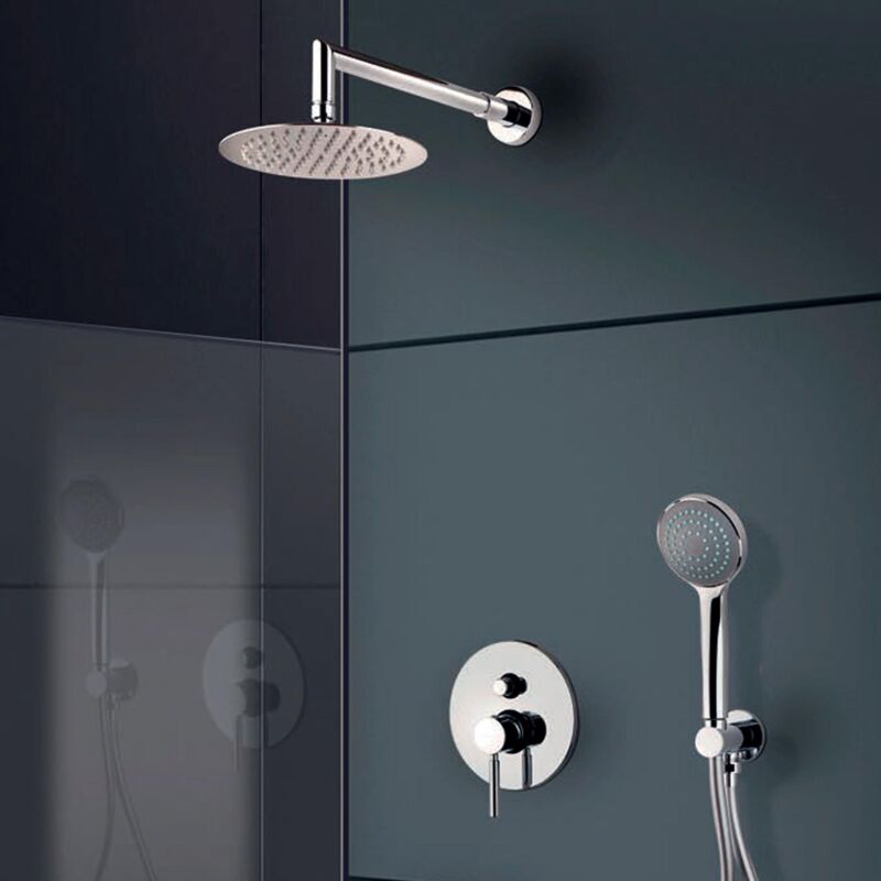 Kit Doccia a Muro Kit Soffione Doccino e Miscelatore in Acciaio Inox Ø25 cm da Parete Bonussi Miami Cromato Kit doccia completo di miscelatore a 2 vie con soffione da 25 cm ultra slim solo 3 mm con ugelli anticalcare ad altra resistenza, soffione ispezionabile per una facile manutenzione. Flessibile anti rottura di colore silver in gomma. Braccio da 40 cm, Doccetta cilindrica in ottone cromato esteticamente accattivante che viene posizionata in un fantastico supporto in ottone cromato con presa dell'acqua integrata . Caratteristiche Tecniche Miscelatore pneumatico con leve di design Doccetta a stick da 20 cm in ottone cromato Braccio da 40 cm Supporto doccetta in ottone cromato Flessibile da 150cm silver