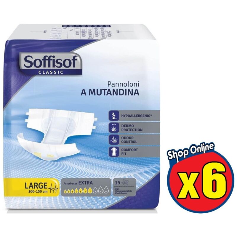 Ausilio assorbente di forma anatomica composto da fluff di pura cellulosa. polimeri superassorbenti e uno strato esterno impermeabile che garantisce la massima sicurezza contro perdite di tutti i tipi. Gli adesivi di fissaggio riposizionabili e l'innovativo design sono stati studiati per garantire il massimo comfort. L'indicatore di umidità a scomparsa graduale suggerisce facilmente il momento del cambio. lo speciale strato esterno traspirante con lembi in puro tessuto aiuta a ridurre l'insorgenza di arrossamenti e irritazioni anche alle pelli più delicate 6 pacchi da 15 PZ ciascuno Pannolini a mutandina apribili Misura: large 100 - 150 cm Assorbenza: 7 su 10 Air dry: Morbido tessuto esterno traspirante Ipoallergenico: test di pro-sensibilizzazione in vitro Controllo Odori: aiuta a ridurre l'insorgere dei cattivi odori Confort fit: Forma anatomica per garantire il massimo confort Dermo Protezione: Arricchito con aloe per la massima delicatezza sulla pelle