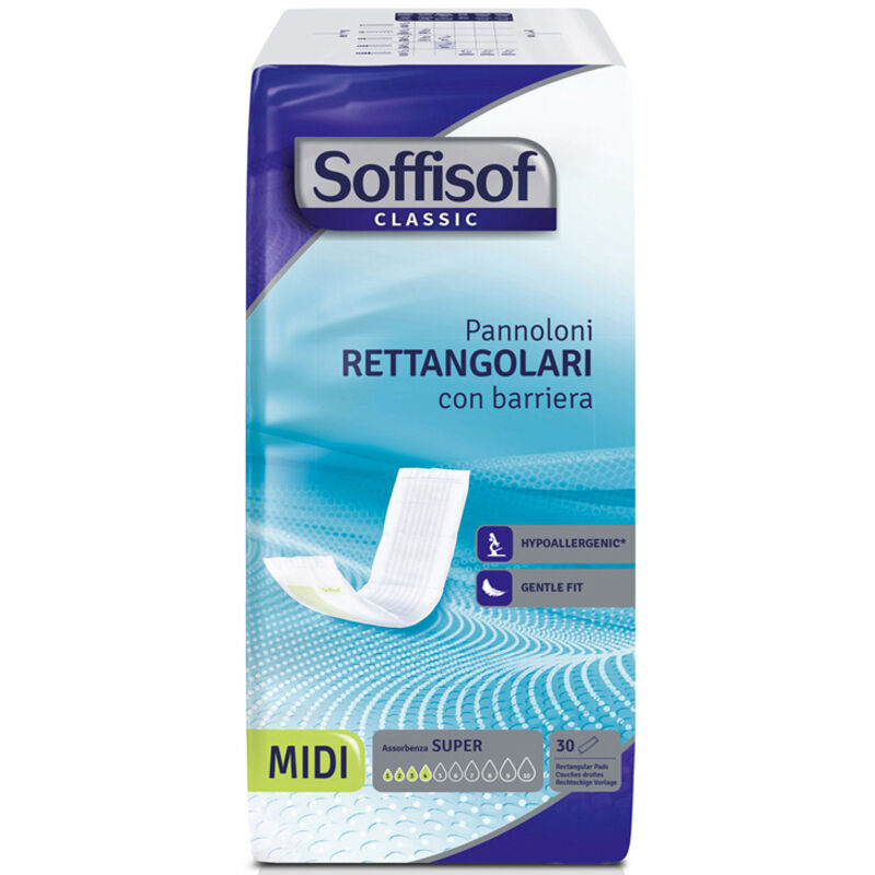SOFFISOF CLASSIC PANNOLINI RETTANGOLARI CON BARRIERA Ausilio assorbente contro le perdite ed è composto da una morbida superficie in tessuto ipoallergenico. Il fluff di pura cellulosa e polimeri super assorbenti aiutano a ridurre l'insorgere dei cattivi odori. E' la soluzione piu' tradizionale per il trattamento dell'incontinenza lieve e moderata. Pannolini rettangolari con barriera Misura: medium Assorbenza: 4 su 10 Confezione da 30pz Controlla odori Ipoallergenici Sempre asciutti Gentle fit: Morbido tessuto non tessuto a contatto con la pelle