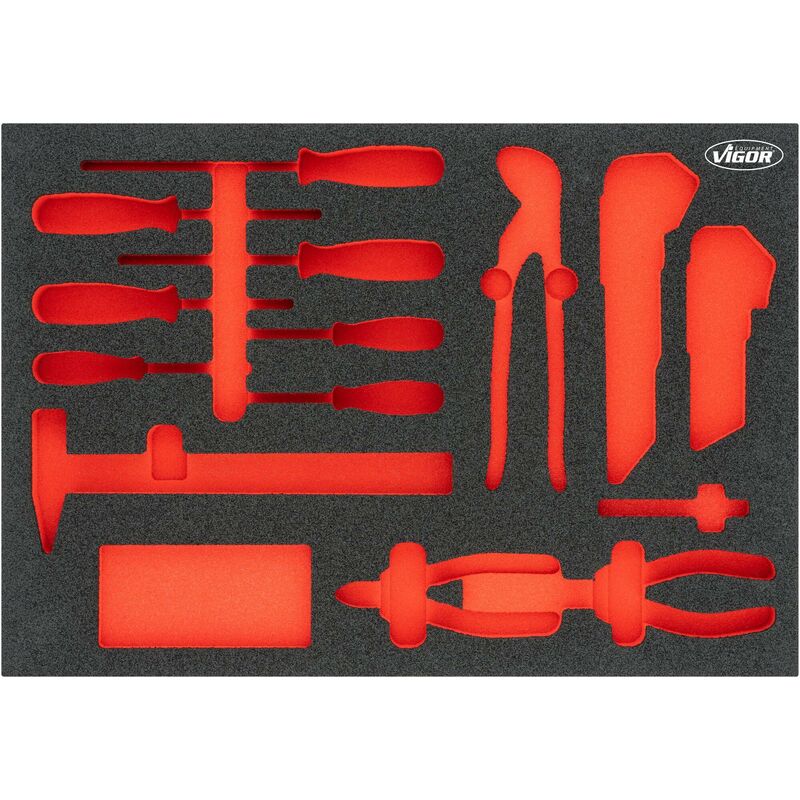2-component soft foam insert Insert measurement / drawer size: L (563 x 393 x 35 mm) VIGOR 2-Alloggiamenti in espanso morbido per componenti Facile da pulire: sciacquare sotto acqua corrente e asciugare Rapida individuazione degli utensili mancati grazie al vano rosso Tutto al proprio posto per un perfetto ordine Protegge gli utensili grazie ad un posizionamento antiscivolo Ogni utensile ha il suo posto predefinito Resistente a oli e grassi Dimensioni / Lunghezza: 563 mm x 393 mm x 35 mm Altezza 35 Larghezza 393 Lunghezza (cavo) 563 Utilizzo V5111N Dimensioni dell'imballaggio 1