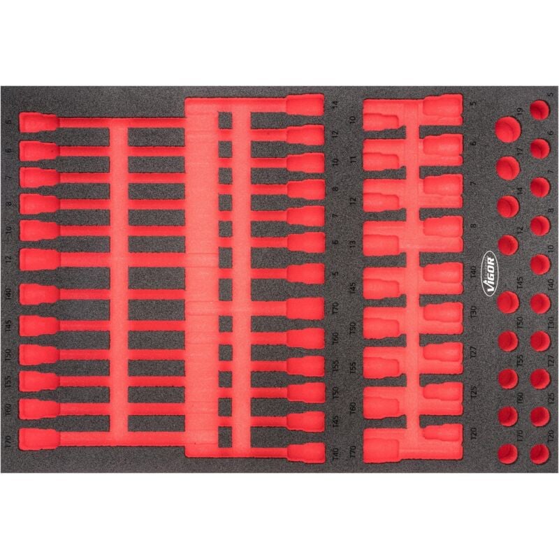 2-component soft foam insert Insert measurement / drawer size: L (563 x 393 x 35 mm) VIGOR 2-Alloggiamenti in espanso morbido per componenti Facile da pulire: sciacquare sotto acqua corrente e asciugare Rapida individuazione degli utensili mancati grazie al vano rosso Tutto al proprio posto per un perfetto ordine Protegge gli utensili grazie ad un posizionamento antiscivolo Ogni utensile ha il suo posto predefinito Resistente a oli e grassi Dimensioni / Lunghezza: 563 mm x 393 mm x 35 mm Altezza 35 Larghezza 393 Lunghezza (cavo) 563 Utilizzo V6809 Dimensioni dell'imballaggio 1