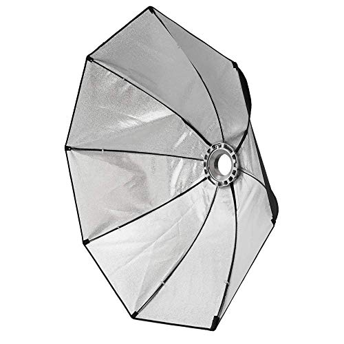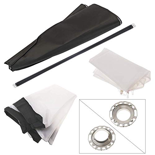 Fornito con cappuccio riflettente, 8 aste flessibili, diffusore in tessuto, tessuto frontale e anello adattatore per mettere a fuoco con anello di fissaggio universale tipo Bowens (diametro di 9.5 cm)