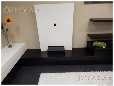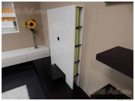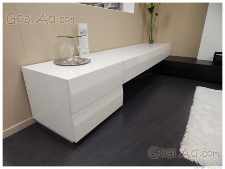 Soggiorno angolare laccato bianco lucido e rovere moro.