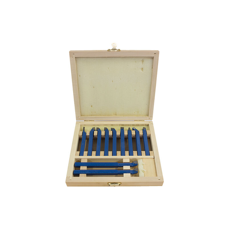 NUOVO SET DI UTENSILI BRASATI UTENSILE PER TORNIO TRONCATORE LAMA COMPOSTO DA 11 PEZZI STELO DA 8 SOGI UBR-11 UTENSILI CON STELO 8 x 8 mm LUNGHEZZA TOTALE UTENSILI N° 2 UTENSILI PER INTERNO: 125 mm. N° 9 UTENSILI: 75 mm. SET COMPLETO PER SGROSSARE, FINIRE, FILETTARE E TRONCARE ... PLACCHETTE IN METALLO DURO BRASATE UTENSILI FORNITI IN APPOSITA CASSETTA IN LEGNO GARANZIA 24 MESI !!!