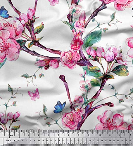 Soimoi Bianchi Rami Tessuto di Raso Pesante, Foglie E Fiore Stampato del Mestiere del Tessuto al Metro 54 Pollici Wide