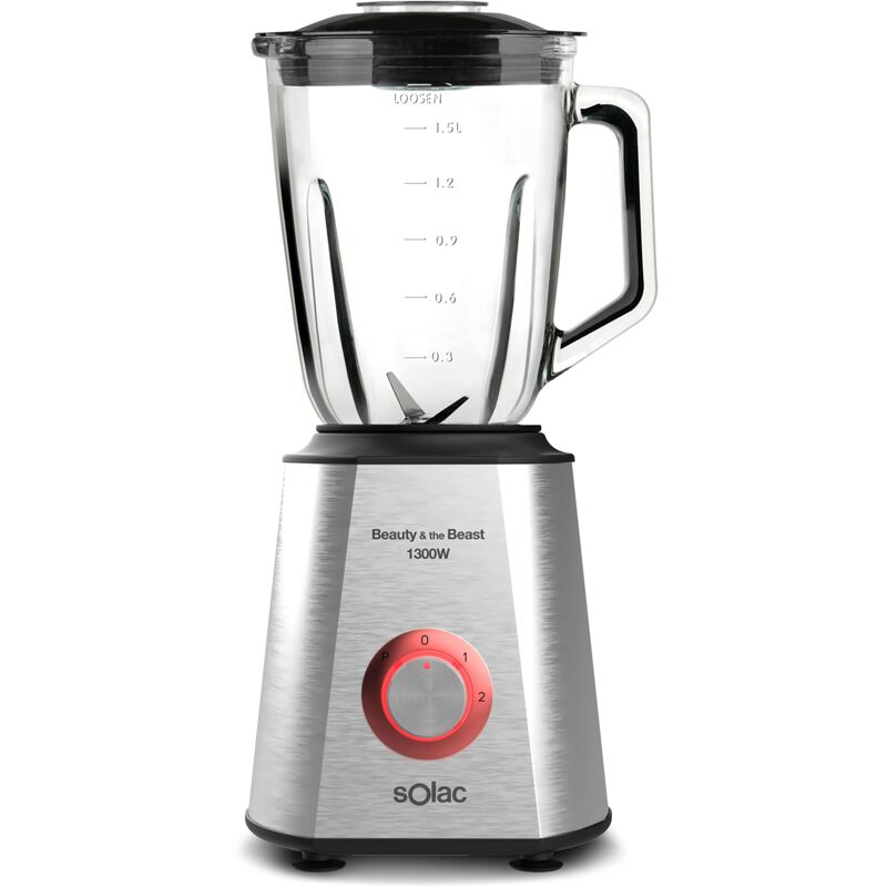 Prepara frullati irresistibili in pochi secondi con il frullatore BV5726 Beauty and the Beast BV5726 di Solac. La potenza massima di 1300W e le 6 robuste lame in acciaio inossidabile ti permettono di creare incredibili frullati, cocktail, granite, shake, smoothie, puree e creme nel minor tempo possibile. Le sue robuste lame in acciaio inossidabile permettono di tritare tutti i tipi di cibi duri e persino di tritare il ghiaccio. Regola la potenza in qualsiasi momento grazie alle sue due velocità e raggiungi la massima forza con la funzione Turbo. La caraffa graduata del frullatore BV5726 di Solac ha una capacità di 1,5L ed è realizzata in vetro super resistente. Il suo coperchio situato nella parte superiore è facile da rimuovere e ha un beccuccio di riempimento e un tappo trasparente. Il manico del frullatore è progettato ergonomicamente per garantire il massimo comfort quando si versa. Il processo di pulizia è molto facile. Basta mettere un po' di acqua e sapone nella caraffa