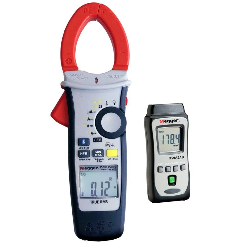 Dettagli tecnici Calibrato di fabbrica senza certificato Categoria di misura (LOV) CAT III 1000 V, CAT IV 600 V Tipo prodotto Pinza amperometrica a energia solare Pinza amperometrica solare KIT1 DCM1500S e strumento di misura dell'irradiazione PVM210 Assicuratevi il nostro kit solare, composto dalla pinza amperometrica a energia solare DCM1500S e dal misuratore di radiazioni PVM210 Pinza amperometrica solare DCM1500S Display LCD retroilluminato con 6000 posizioniVoltSeek (rilevamento della tensione senza contatto)Misurazione del valore effettivo reale su CARegistratore di dati (fino a 4000 valori di misura)Modalità di memorizzazione manualeLa torcia si accende quando le ganasce del morsetto sono aperteMISURAZIONE DELLA CORRENTE CA/CC 1500 A.Misurazione della resistenza 600 kΩ / numero di continuitàMisurazione della tensione continua fino a 2000 V con kit di conduttori HVPVAPP Bluetooth/Megger-Link ®Misurazione della tensione AV fino a 1500 V con kit di conduttori HVPVFrequenzaTest di