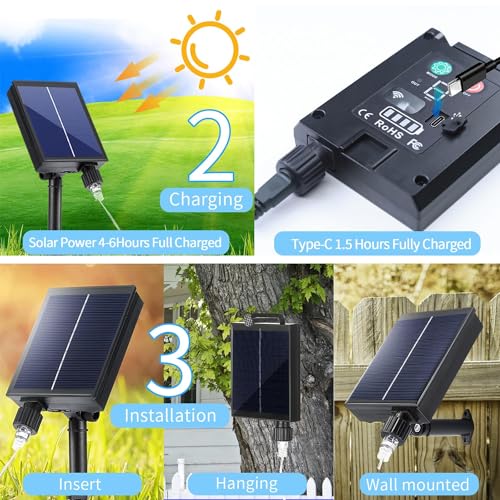 Ricarica completa entro 4-6 ore durante una giornata sole accensione automatica "ON" notte. Capacità 1200 mA può supportare luci natalizie esterne che funzionano per 12-24 ore più. Pannello solare anche un'interfaccia tipo C richiede solo 1,5 ore per caricarsi completamente.