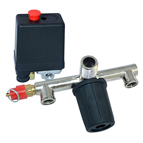 Interruttore di pressione per compressori: con riduttore di pressione - Valvola di sicurezza 8,8 bar - 2 pezzi manometro e 2 raccordi rapidi ad aria compressa