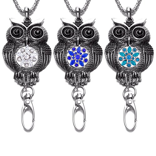 Soleebee intercambiabile catena argento 87 cm retro Owl ID badge LanYard Necklace bonus 6pcs lega strass pulsanti automatici