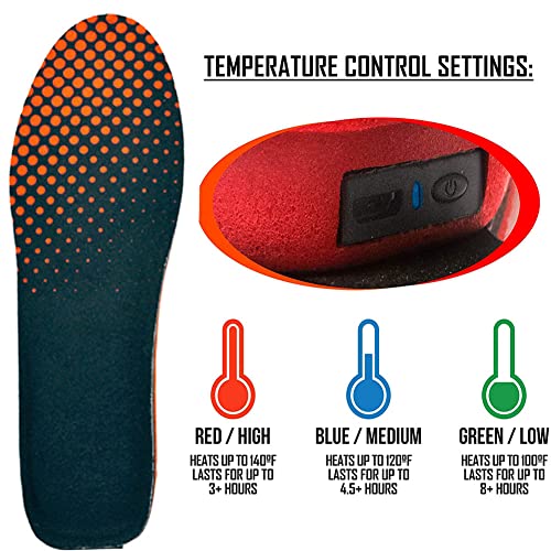 ▷ Telecomando wireless: le solette riscaldate ricaricabili includono telecomando wireless, questo rende semplice regolare la temperatura e accenderle o spegnerle, 3 impostazioni di calore da 104 ° F a 149 ° F, dotato di una batteria ricaricabile da 2200 mAh di grande capacità, il calore dura fino a 8 ore con una singola carica!