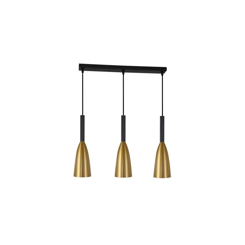 Solin 3 sospensione linea oro - questa è un'altra versione della lampada Solin, solo in una versione più grande. Non si può certo negare la sua eleganza, modestia, ma anche chic! Questo prodotto presenta tre paralumi dorati dalla classica forma ad A. Danno una bella luce grazie a tre fonti di luce. Il tutto è montato su un telaio orizzontale nero in metallo e tre cavi di uguale lunghezza. Aggiungerà un fascino meraviglioso se appeso nella sala da pranzo sopra il tavolo o semplicemente in cucina sopra l'isola. Si abbinerà magnificamente al rosso, al nero e al verde scuro. La lampada è destinata ad interni moderni piuttosto che vintage, anche se ultimamente le combinazioni di questi due stili sono diventate abbastanza comuni. Qui presentiamo la versione dorata, anche se per vostra comodità e scelta ci sono anche altri colori della lampada Solin. Ti invitiamo a familiarizzare con l'offerta nel nostro negozio online Dimensioni: 50 x 100 cm Materiale predominante: Metallo Tipo di